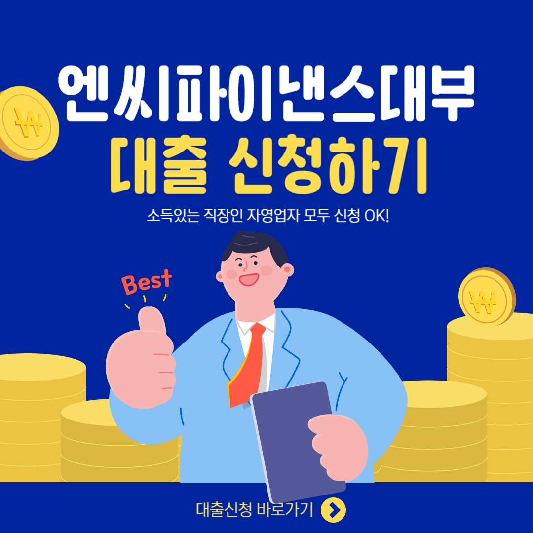 타 금융기관에서 대출 거절되신 분! 당장 급전이 필요하신 분이라면 아래에서 엔씨피아낸스대부와 금감원 선정 우수 대부업체 대출을 모두 확인해보시길 추천 드립니다.