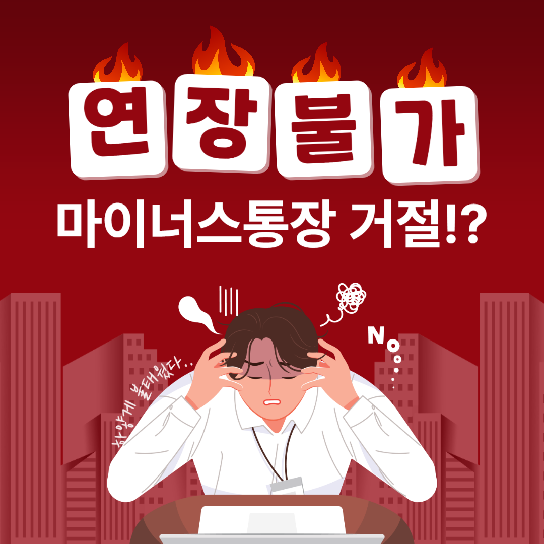 대출 연장이 거절되었다고 포기하실건가요? 마이너스통장이 연체되면 신용등급에 아주 치명적입니다. 아예 금융거래를 하지 못할 정도로 신용불량자가 되고, 다른 은행의 심사 자체가 불가능해집니다.