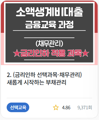 소액생계비대출은 금융교육 총 3과목 중 1과목을 필수로 이수하셔야 합니다. 금융교육은 서민금융진흥원 교육포털에서 온라인으로 수강이 가능합니다.