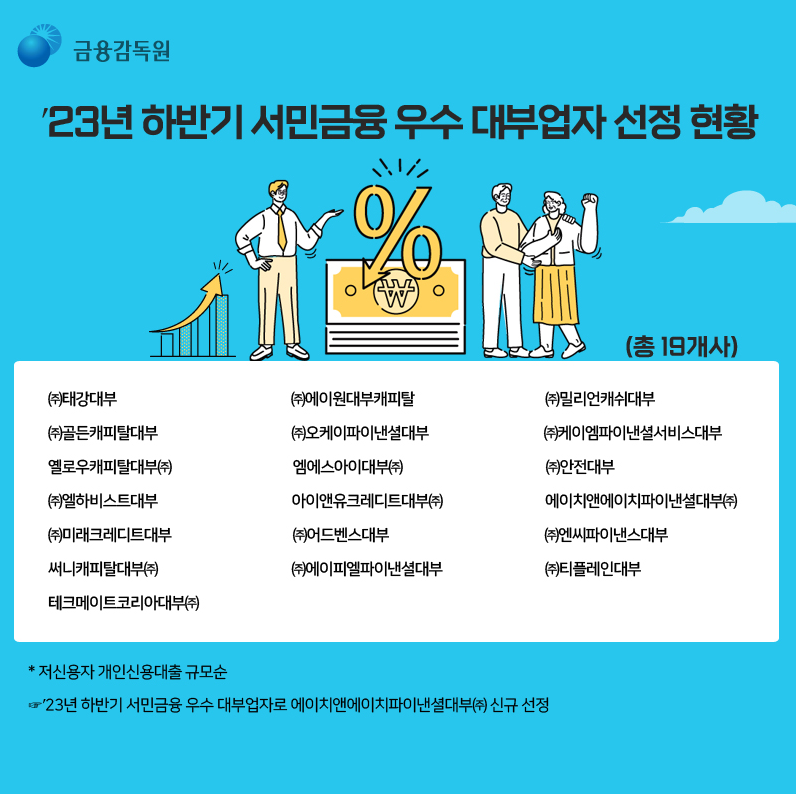 23년 하반기 서민금융 우수 대부업체는 총 19곳입니다. 오랜 기간 대부업체로서 브랜드 평판이 좋은 태강대부를 비롯하여 밀리언캐쉬대부, 미래크레디트대부, 에이원대부캐피탈 등이 있습니다.