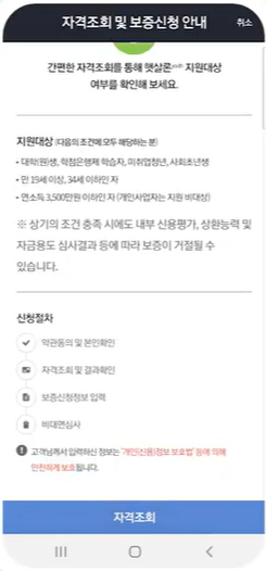 2. 서민금융진흥원 회원가입 후 로그인을 진행합니다. 햇살론 유스의 자격조건을 확인한 후 자격조회를 클릭합니다.